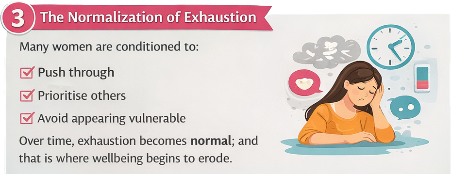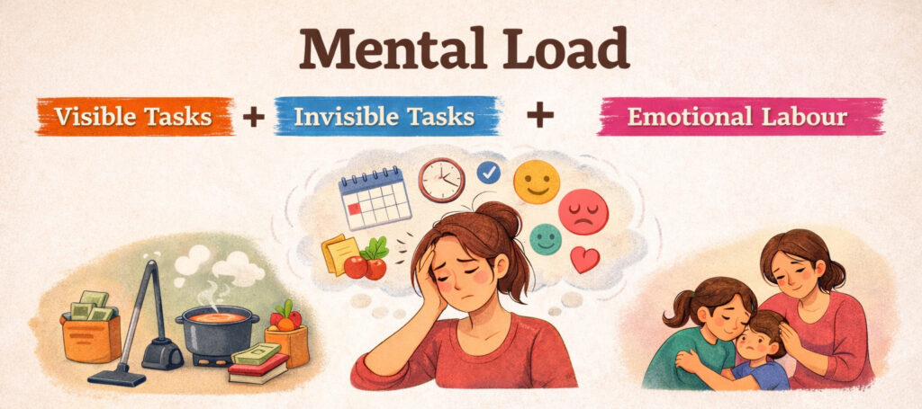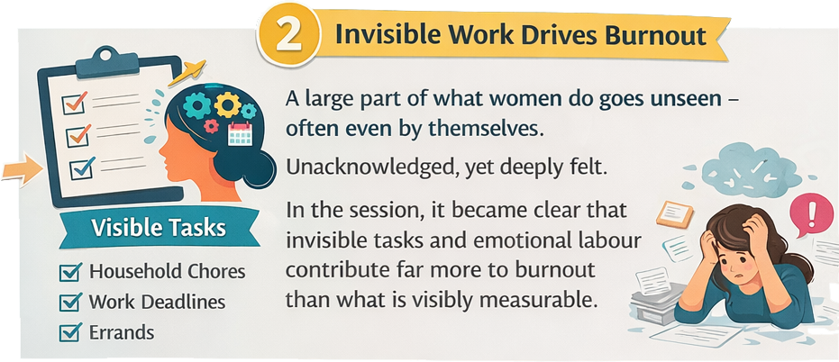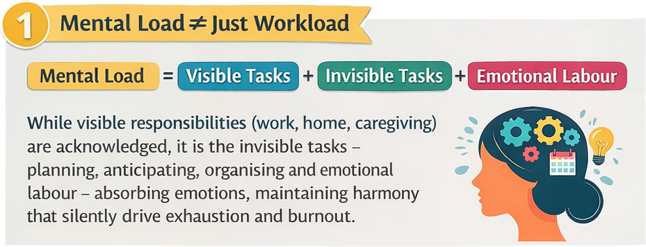 While visible responsibilities (work, home, caregiving) are acknowledged, it is the invisible tasks – planning, anticipating, organising and emotional labour – absorbing emotions, maintaining harmony that silently drive exhaustion and burnout.